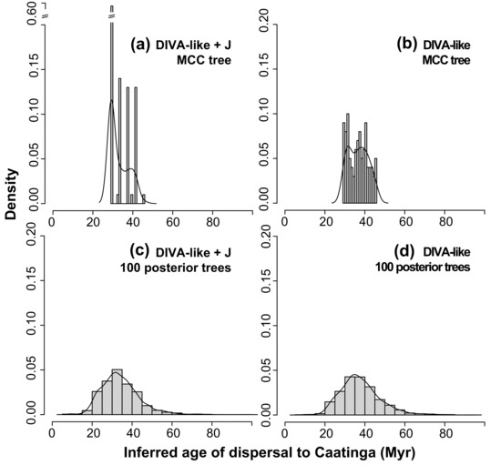 We inferred the age of the dispersal event to the Caatinga and discovered a similar pattern to what we observed regarding the Galapagos. When using a MCC tree, the estimates are sharp and overconfident (Figure 7a,b), especially in the analysis including founder-event speciation, which shows four peaks closely tied to the ages of the cladogenetic events immediately leading to the Caatinga clade. Using 100 posterior trees to estimate the age of the dispersal event incorporates the uncertainty in the node ages, and reduces the differences between DIVA-like and DIVA-like + J (Figure 7c,d).