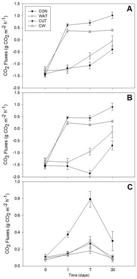 Considering the whole mesocosm measurements, there was an interaction between treatments and sampling times (F(9,132) = 11.06; p < 0.001), but no differences were recorded across the treatments before these were applied (p = 0.999), with an average uptake of −1.36 ± 0.06 g CO2 m−2 h−1 (Figure 1A). One day after leaf removal, significant carbon dioxide emissions were found in both the CUT (95% CI = 1.13, 2.28) and CW (95% CI = 1.08, 2.04) treatments, respectively, in comparison to CON (Figure 1A). The highest CO2 emissions (1.02 ± 0.14 g CO2 m−2 h−1) were found in the CUT treatment after 30 days (95% CI = 0.77, 1.27; Figure 1A). For the WAT, there was a gradual reduction in CO2 uptake over the course of the experiment, which was 21-fold smaller (−0.06 ± 0.23 g CO2 m−2 h−1; 95% CI = −0.31, 0.19) when compared to the start of the study (−1.27 ± 0.10 g CO2 m−2 h−1; 95% CI = −1.52, −1.02; Figure 1A). Similarly, there was a three-fold reduction in CO2 uptake in CON (95% CI = −0.65, −0.15) in comparison to the beginning of the experiment (95% CI = −1.67, −1.17). However, CON still had lower CO2 emissions than CUT (−1.42, 95% CI = −1.90, −0.93) and CW (−0.81, 95% CI = −1.29, −0.33) at the end of the experiment. The pattern of CO2 fluxes associated with G. tinctoria plants (Figure 1B) followed that described for the whole mesocosm measurements (Figure 1A). However, soil CO2 emissions were significantly higher in CON at 1, 7, and 30 days (F(9,132) = 3.012; p = 0.003; Figure 1C).