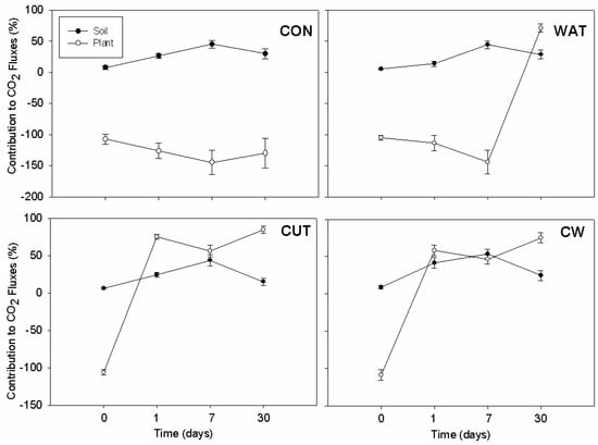 Before the application of any treatments, CO2 emissions originating exclusively from soil ranged from 5.5 to 8.8% across all treatments (Figure 2). During the experiment, there was a small increase in soil CO2 emissions in all treatments, reaching a maximum after seven days, although the values at the end of the experiment were comparable to those at the beginning (Figure 2). After the application of the different treatments, most of the CO2 fluxes were derived exclusively from G. tinctoria plants, with their contribution to the fluxes increasing with time, but varying amongst treatments. Whilst CO2 uptake in CON was reduced throughout the experiment, all the other treatments resulted in significant emissions, although the patterns varied. Significant emissions were found one day after leaf removal, irrespective of waterlogging, in the CUT and CW treatments, whilst net emissions were only found after 30 days in WAT.