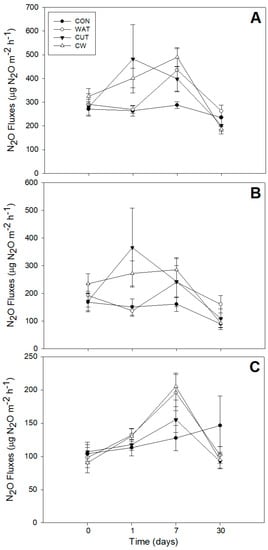 Nitrous oxide fluxes varied significantly with time (F(3,210) = 21.03; p < 0.001), but none of the treatments were significantly different from each other (F(9,210) = 1.85; p = 0.061; Figure 3A) at any sampling time. Whilst N2O emissions stayed in the same range for all sampling times in CON, with an average of 264.5 ± 1.18 µg N2O m−2 h−1 (Figure 3A), WAT had its highest emissions at seven days (435.9 ± 89.73 µg N2O m−2 h−1; 95% CI = 330.2, 540.9; Figure 3A). Leaf removal treatments led to higher emissions, and CUT had its highest emissions one day after leaf removal (482.5 ± 143.55 µg N2O m−2 h−1; 95% CI = 380.4, 596.7) and CW at one week after the treatment was applied (489.8 ± 41.03 µg N2O m−2 h−1; 95% CI = 384.4, 595.5; Figure 3A). Plant-mediated N2O emissions followed the same pattern (Figure 3B) described for total emissions (Figure 3A). On the other hand, we found differences between the treatments for soil N2O emissions (F(9,132) = 2.52; p = 0.011; Figure 3C), and at seven days, CW showed higher soil N2O emissions (95% CI = 7.19, 148.4) than CON.