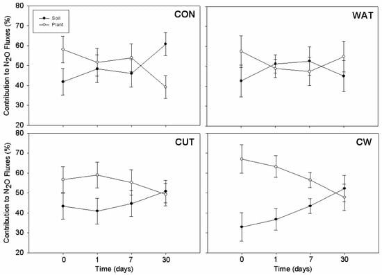 Percentage contribution of the soil or plant-related N2O fluxes to the total mesocosm N2O fluxes in the different treatments at varying sampling times (0, 1, 7, and 30 days), in experiments conducted on G. tinctoria at UCD’s Rosemount Environmental Research Station glasshouse, Dublin, Ireland, July–August 2017 (n = 12; mean ± SE). Legend CON = control plants subjected to normal watering; WAT = plants subjected to flooding; CUT = plants that had the leaves cut from the petioles but were watered normally; CW = plants where leaves were removed and were also subjected to rhizome flooding.