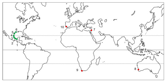 Geographical locations of the populations of Oenothera drummondii studied. Mexico: Native populations (green dots). Mexico: 1. Ojoshal (OJO); 2. Sontecomapan (SON); 3. La Mancha (MAN); 4. Tecolutla (TEC). US: 5. South Padre (SPA); 6. Bolivar (BOL). Non-native populations (red dots). Israel: 7. Rishon-Lezion (LEZ); Australia: 8. Mandurah (MAH). South Africa: 9. Muizenberg (MUI). Spain: 10. El Dique (DIQ). Line of Ecuador (solid black line) and intertropical region are shown (dashed black lines).