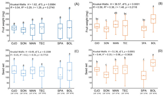Fruit weight (A,B) and seed set (C,D) obtained by self- (blue boxes) and cross-pollination (orange boxes) in native populations of Oenothera drummondii. Comparison among populations (Kruskal–Wallis nonparametric ANOVA) and the relationship between the reproductive characteristic and latitude (linear regression analysis) are shown in each graph. Population acronyms are explained in Table A1. Latitudinal ubication is indicated below each acronymous. Different letters above the boxes indicate significant differences among populations (Steel–Dwass all pairs multiple comparisons p < 0.001). Boxes show the average (x), median (-) and quartiles.