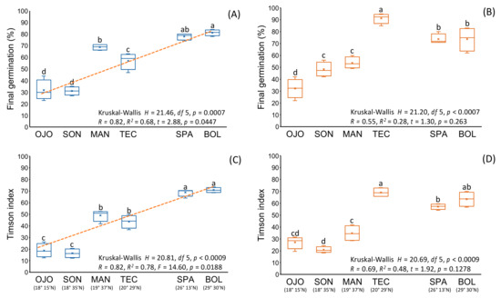 Final germination and Timson index of the seeds obtained by self- (A,C) and cross- (B,D) pollination in native populations of Oenothera drummondii. Comparison among populations (Kruskal–Wallis nonparametric ANOVA) and the relationship between the reproductive characteristic and latitude (linear regression analysis) are shown in each graph. Population acronyms are explained in Table A1. Latitudinal ubication is indicated below each acronymous. Dotted lines representing significant regression analyses but are not in scale with the latitudinal increase. Different letters above the boxes indicate significant differences among populations (Steel–Dwass all pairs multiple comparisons p < 0.001). Boxes show the average (x), median (-) and quartiles.