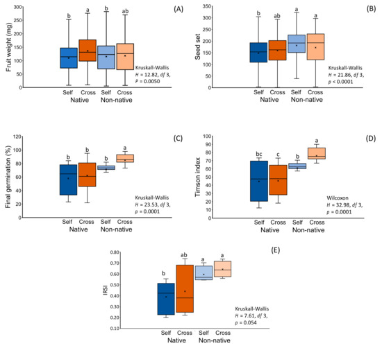 Comparison between groups of native and non-native populations of Oenothera drummondii of the characteristics of fruit weight (A), seed set (B), final and rate germination (C,D) and the integral reproductive success (IRSI) (E), obtained by self- (Self) and cross-pollination (Cross). The result of the Kruskal–Wallis nonparametric ANOVA is shown on each graph. Different letters above the boxes indicate significant differences (Steel–Dwass all pairs multiple comparisons, p < 0.001). Boxes show the average (x), median (-) and quartiles.