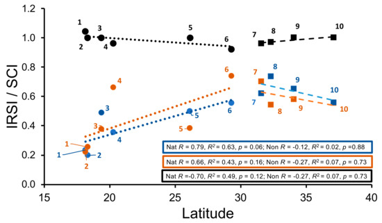 Relationship between self-compatibility index (SCI) (symbols and line black) and the integral reproductive success index (IRSI) of self- (symbols and line blue) and cross-pollination (symbols and line orange) with the latitudinal location of native and non-native populations of Oenothera drummondii. The boxes show the results of linear regression for each index for native (Nat) and non-native (Non) populations. Circles indicate native populations and squares indicate non-native populations. Numbers indicate acronyms of populations described in Figure 1.