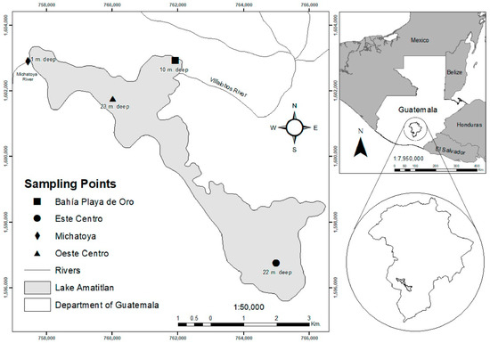 Lake Amatitlán is the fourth largest lake in Guatemala, Central America, and one of the most emblematic waterbodies of this country. This lake is a warm monomictic waterbody in the highland of Guatemala, located at an altitude of 1186 m above sea level (m.a.s.l.), with an area of 15.2 km2 and 11 km length and a maximum depth of 23 m. Its formation originated from volcanic activity of Pacaya, Fuego, and Agua in the late Quaternary [10,14,17].