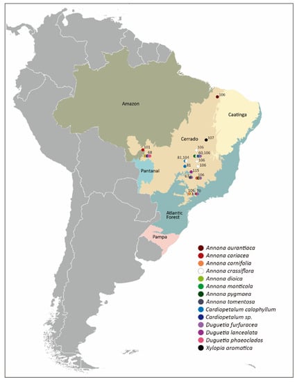 Unlike the remaining basal angiosperms, which currently include at most a few hundred relict species, Annonaceae underwent greater ecological radiation and wider diversification [11]. With a pantropical distribution, the family includes approximately 2430 species in 110 genera. In Brazil, 400 species in 29 genera occur [9,12].