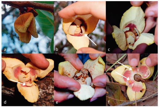 The beginning of the rainy season coincides with leaf sprouting in A. crassiflora (Figure 3), locally known as araticum. The nearly solitary floral buds, which take months to develop, acquire a ferruginous-yellow coloration, and the flowering period commences, with a few flowers opening up each night at the beginning of the rainy season and commencement of an intense blossoming phase between November and December. The corolla has two whorls: the most basal one is composed of three external fleshy and thick petals, whose abaxial face is ferruginous-tomentose and at times greenish and lighter (Figure 3a); the abaxial face is somewhat concave, cream-colored on the edges, and characterized by a distinct crimson patch on its basal third. The external petals thicken from base to apex, showing a retuse to acute shape (Figure 2c and Figure 3b–f). The most apical whorl of the perianth is formed by alternating outer petals and inner light-yellow petals, the latter of which are much smaller and thinner but rigid and with a shape similar to that of the outer petals (Figure 3b–f). At the base of the inner petals, on the adaxial surface, there are two distinct basal lobes that are small and laterally positioned (Figure 3f). The mature flower is pendant and shows a fruit-like aspect, with external petals lightly parted just enough for Cyclocephala to pass through (Figure 3a) [14,66,72,102,103].