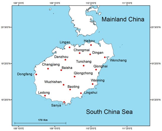 Hainan is the second largest island (located between 108°37′~111°03′ E and 18°10′~20°10′ N) in the South China Sea (Figure 1). The total land area of Hainan is approximately 33,920 km²; 42.5% of which is in the tropical zone. Hainan is the largest tropical island in China. Most of the hills have an elevation of 500~800 m, and more than 81 hills are higher than 1000 m. The mean temperature is 23~25 °C and the mean rainfall is 1728 mm. The Nandu River, Changhua River, and Wanquan River are the three largest rivers on Hainan Island, and each has a catchment area of more than 3000 km².