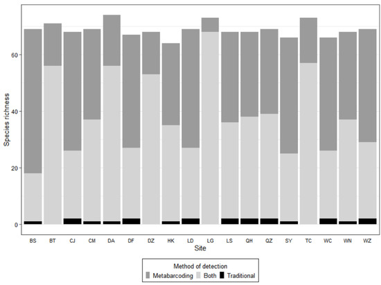 Species richness per site as detected with traditional and eDNA metabarcoding methods. The species caught only with traditional methods are shown in black, those detected only with the metabarcoding method are shown in dark gray, and those detected by both metabarcoding and traditional methods are shown in light gray.