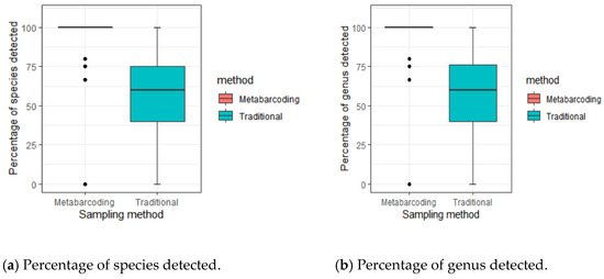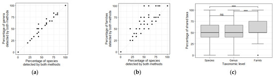 The percentage of families detected by the two methods was higher than the percentage of species (Dunn test: z = 3.13, p < 0.001; Figure 4b,c) and genera (Dunn test: z = 3.04, p = 0.0011; Figure 4c) detected by the two methods.