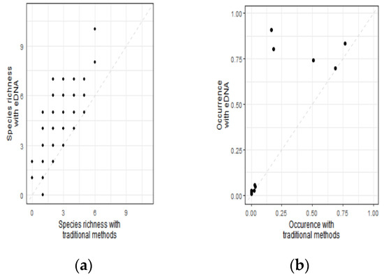 Relationships between species richness (a) and species occurrences (b) determined by the metabarcoding and traditional methods for (a) all data. Species occurrences are expressed as the percentage of sites where a species was detected. The 1:1 line is represented by the dashed line on all plots.