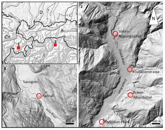 Excavations were carried out in 2002–2003 in Brixen—Köstlanerstrasse by the Archaeological Heritage Office of Bolzano and unearthed a huge settlement area (2000 m2) dating to the Late (Final) Bronze Age (Laugen A) []. The site is located on an ancient river terrace of the river Rienz (ital. Rienza), near its confluence with the river Eisack (ital. Isarco), at about 560 m above sea level.
