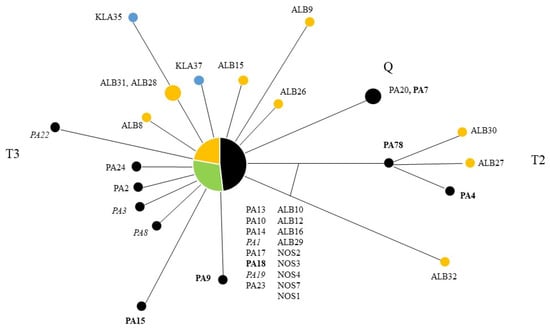 The median joining network shows that almost all haplotypes are private, except the main T3 haplotype, the Q haplotype shared by two individuals from Padnal (PA20, PA7), and the T3/T4 haplotype shared by two individuals from Albanbühel (ALB31, ALB28) (Figure 2).