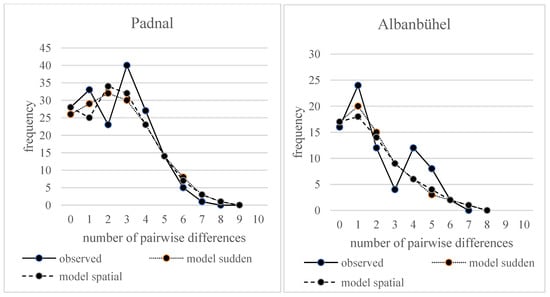 Keeping in mind that archaeological samples are not a real intermixing population, to tentatively infer demographic events such as the sudden increase in population size or spatial expansion, mismatch analyses of cattle from the sites Albanbühel, North Italy, and Savognin Padnal, Switzerland, were performed. The site Vahrn-Nössingbühel was not considered, because of very low sample size of five individuals.
