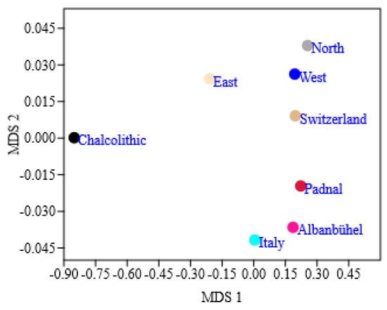 Nonmetric multidimensional scaling (MDS) was computed with the PAST version 4 software [] using Reynolds genetic distances calculated with Arlequin [] based on a 197 bp sequence length shared between all used sequences. Modern cattle populations were broadly geographically grouped to Italy (n = 213), East (n = 94), West (n = 46), North (n = 22), Switzerland CH (n = 22), and Chalcolithic (n = 8) [,,,,] (Table S2). Archaeological samples from Padnal (n = 19) and Albanbühel (n = 13) are according to Table 1.