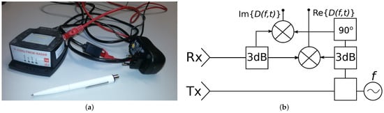 IMST sentire FMCW 60 GHz Radar Module: (a) photo; (b) a corresponding generalized block diagram of a CW/FMCW radar system with transmitter and receiver channels and I/Q demodulator. The diagram consists of the following elements: the signal source for the generation of a (frequency-modulated) signal, transmitter antenna (Tx), receiver antennas (Rx), mixers for the generation of the intermediate frequency, digital sampling unit; also, the device comprises other elements: couplers, filters, amplifiers, phase shifters. Antennas reside on the top of the device.