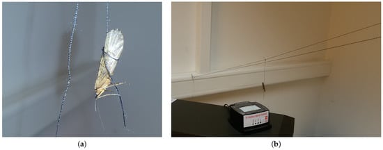Phryganea grandis: (a)—tied with a thread, (b)—placed above the radar.