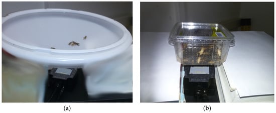 Experiment IIIb. We used a transparent plastic packing box for the second part of the experiment (see Figure 3, right). In this part, insects remained relatively calm compared to the previous part (i.e., Experiment IIIa). Shaking was not required here. In such conditions, insects could leave the radiating zone, but some of them remained radiated most of the time. This led to relatively natural conditions when insects behaved relatively randomly.