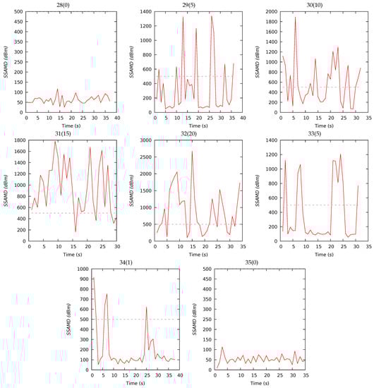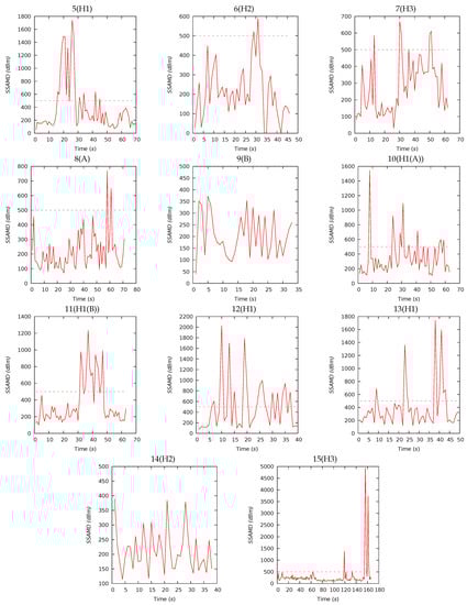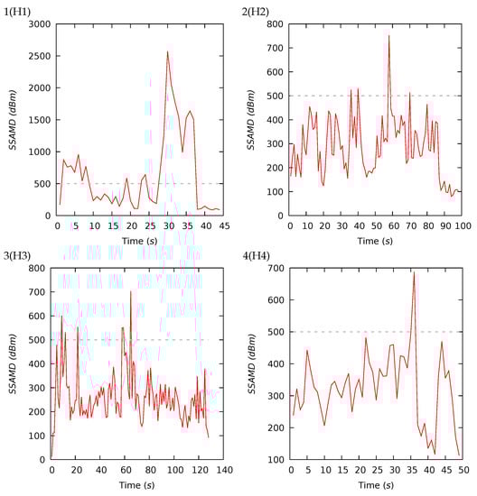 where t is a time moment or a file number ordered by time; depends on a time interval defined by the user (we use 1 s interval, so = 1 s/50 ms = 20. c is a channel number (in our case, , i.e., all available channels and ). d is a distance (an index of a magnitude in a list of magnitudes ordered by the distance); in our case, . m is a magnitude value. One can mention that an absolute difference between the current and previous moment is calculated. is simply a sum of all absolute differences. In other words, the parameter calculates aggregated magnitude differences in a considered time interval, representing the observed noise dynamics as a single integer value.