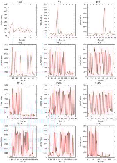 Experiment III consists of two main steps: (a) trials 16(0)–27(0) depicted in Figure 6, (b) trials 28(0)–35(0) depicted in Figure 7. This experiment aims to disclose if it is possible to estimate the biomass using the considering radar setup. For every step, we use the various number of crickets provided in parentheses (i.e., 31(15) means trial number 31 with fifteen crickets); this applies for all trials of Experiment III. Since we will use a light trap to attract more insects in future fieldwork, we use the diffuser (light trap’s attractive screen) during this experiment. In addition to biomass estimation, the second step of Experiment III enables us to estimate ranges of caused by many insects. This is important because the light trap will also attract many insects in field conditions.