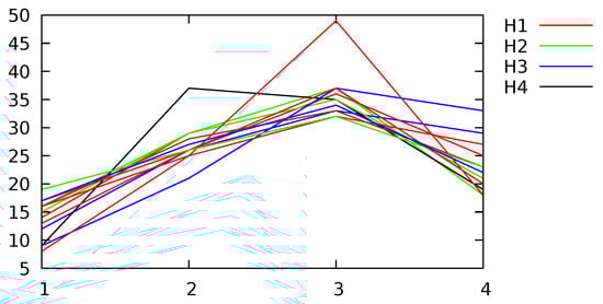 We provide Figure 9 illustrating data from Table 1 regarding height interval contributions. Colored lines are for experiments conducted with an insect at a particular height interval (i.e., for acts comprising a height interval in their names). The plot shows the received magnitudes contribution (in percent) for all altitude levels. Let us consider specific height interval magnitudes’ contributions (see height contributions in Table 1) for trials with insects placed at height intervals H1, H2, and H3. We consider the following trials: H1—1(H1), 5(H1), 10(H1(A)), 11(H1(B)), 12(H1), and 13(H1); H2—2(H2), 6(H2), and 14(H2); H3—3(H3), 7(H3), and 15(H3). It is easy to confuse height interval magnitudes’ contributions (presented in the resulting table) and height intervals where insects were placed. The radar records magnitudes ordered by ranges (or distance from the radar); the ranges are estimated and, in our case, do not allow the actual target ranges to be calculated. We split these magnitudes using the earlier defined height intervals utilized for insect placing. The attached data [] and software archive provide all concrete details (see Appendix D).