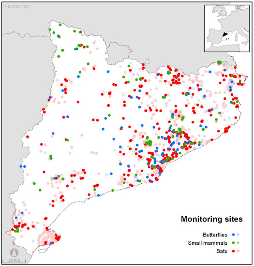 Since the beginning of biodiversity monitoring in Spain, the Natural Sciences Museum of Granollers (hereafter NSMG) has played a central role. The NSMG holds the BiBio Research Group, which coordinates four CS programmes, targeting butterflies, common small mammals, bats and arboreal mammals. These taxa have long been recognized as bioindicator groups, for landscape modifications, habitat degradation, climate change and environmental pollution, for instance, owing to their relevant ecological role in terrestrial ecosystems [24,25,26,27,28,29,30,31], which makes monitoring programmes focused on these groups especially valuable. While the use of a standardized sampling method for butterflies throughout Europe has made it possible to calculate relevant bioindicators at the continental scale [19], this was not the case for the other monitored groups in the earliest stages. In the case of bats, the development of bioacoustics has opened new possibilities for monitoring populations of either elusive or cryptic species. In the case of small mammals, a plethora of available sampling methods precluded a widespread standardization of monitoring programmes at large geographical scales. For both bats and small mammals, we have proposed in recent decades the implementation of new standardized sampling methods for monitoring their populations, since no or few other monitoring programmes are yet available at the European scale.