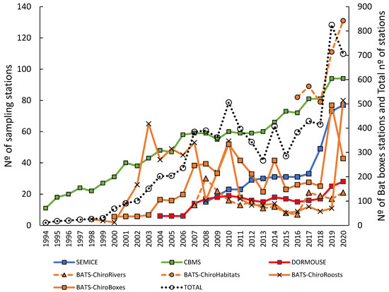 Number of sampling stations per monitoring programme along the study period (1994–2020). The right axis shows the number of bat boxes (the ChiroBoxes protocol), and the total number of stations.