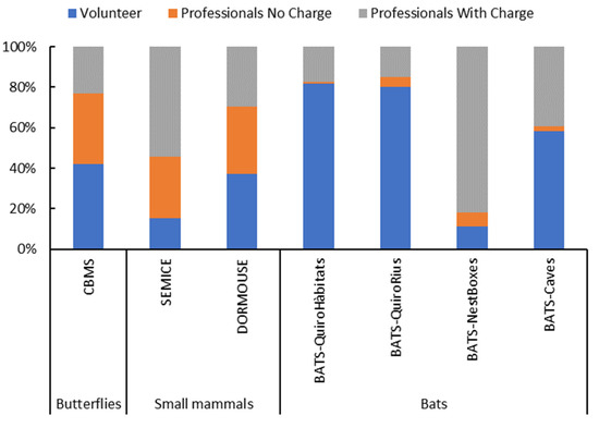 Programme chart and coordination: Finally, in terms of coordination teams and the programme chart, the proportion of paid-job positions within each programme greatly affects their capacity to prevail. Altogether, almost half of the stations are in charge of professionals (49% with cost to the projects) and 37% are overseen by volunteers. The contribution of volunteers to the monitoring schemes is heterogeneous (Figure 3), from less than 20% of stations in SEMICE and Bat-ChiroBoxes, to close to 80% of the stations in Bat-ChiroHabitats and Bat-ChiroRivers, with intermediate values in CBMS and the Dormouse project (40%). Despite volunteer-based monitoring being a potential solution for maintaining time-consuming and expensive data collection [1], our monitoring schemes include a substantial portion based on professional staff, in which experienced scientists are hired by or involved in the different projects. Some authors consider that a CS programme must include half of the stations monitored by volunteers [7], and in our case, only three out of four protocols within the bat programme meet this condition. The other three programmes are below 50%. This imbalance is only possible because the projects are subsidized by the Catalan Administration. Although these subsidized models may be in danger when economic crises occur, they have overcome the economic difficulties resulting from the two most recent crises (2008–2013 and 2020–2021).