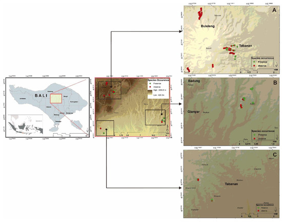 Research locations: (A). Bukit Tapak nature reserve, (B). Pilan customary forest, and (C). Jatiluwih. Green dot represent the presence of this species and red dot represent the absence of this species in those locations.