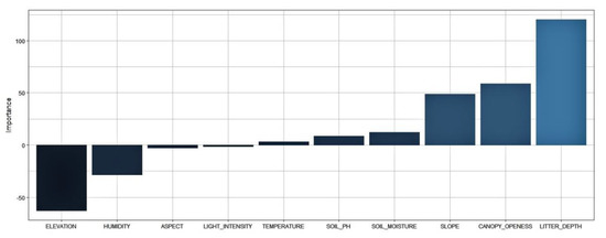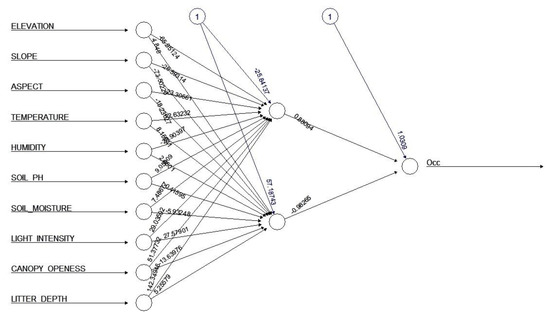The ANN suggested that there were several environmental variables that influenced the species’ occurrence. These environmental variables were litter depth, elevation, canopy openness and slope. Those variables had higher scores than the others. The elevation indicated that there was a negative association with species occurrence. Conversely, litter depth and canopy openness had a positive association with species occurrence (Figure 7).