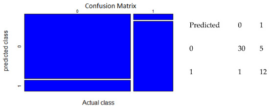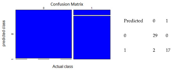The confusion matrix represented true presence, false presence, true absence, and false absence. The confusion matrix was calculated using the 48 test data sets that were selected from total number of observations. The ANN model with 2 nodes yielded a confusion matrix with 29 true absences, 0 false absences, 17 true presences, and 2 false presences (Figure 4). The confusion matrix of RF model with “mtry” = 6 showed that there were 30 true absences, 1 false absence, 17 true presences, and 5 false presences (Figure 5).