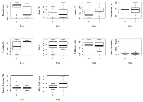 The Artificial Neural Network (ANN) and Random Forest (RF) models were used to assess the environmental variables that influenced the predicted occurrence of P. arinasae. Based on a qualitative assessment of ten environmental variables, it appeared that elevation, slope, aspect, litter depth and humidity were different between the locations where the species was present and absent (Figure 6).