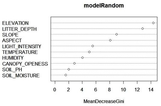 The RF predictive model implied that there were four environmental variables that most influenced the species occurrence. Those variables were elevation, litter depth, slope, and aspect (Figure 8). The score of each environmental variable is presented in Table 3.