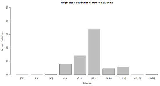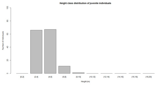 In the sampled plots, mature individuals represented the bulk of the population across size classes. Mature individuals were found with heights from 4 to 20 m. The highest number of mature individuals was seen in the height class of 10–12 m (Figure 9). Juvenile individuals were found in the class grouping with heights from 2 to 10 m. The highest number of juvenile individuals were seen in height class of 4 to 6 m (Figure 10). Seedling individuals were only found in the height class from 0 to 2 m. A total of 3327 individuals were located at all the study sites. Most of the individuals (91.6%) were seedlings, with only 134 of them (4%) in the mature stage.