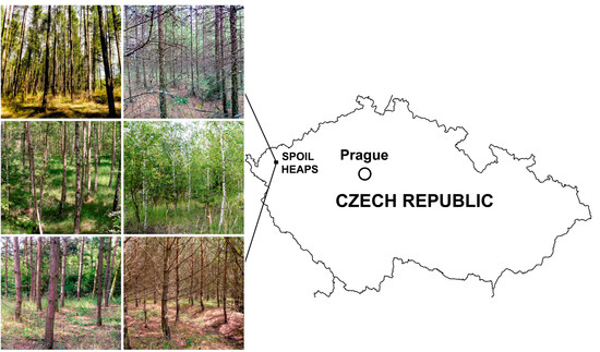 The study was conducted on the ‘Velká Podkrušnohorská’ spoil heaps in Czechia (50°14′ 31″ N, 12°40′45″ E) (Figure 1). This site contains mainly tertiary clays of the Cypris series, which are composed mainly of montmorillonite, illite, and caolinite and are well supplied with mineral nutrients (total P, especially). This is the overburden material from a nearby lignite mine [37]. The mean annual precipitation is 800 mm, and the mean annual temperature is 7 °C [38]. The pH of the substrate in the initial successional stages was 8 to 9 [39].