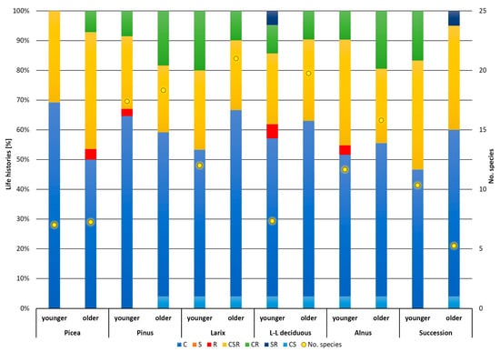 Life histories—distribution of functional groups in forest type and different ages. C—competitors, S—stress strategy, R—ruderal strategy, and their combinations.