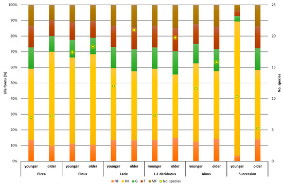 The distribution of plants into Raunkiær life forms was fairly even across all vegetation types (Figure 3). Only in successional stands was the proportion of hemicryptophytes the highest, while geophytes, therophytes, and macrophanerophytes were less represented than in the other forest types studied. The presence of macrophanerophytes in the herbaceous layer indicates natural rejuvenation of the stands. The number of species relative to total herb abundance is visualized in Figure 4. The highest abundances were found in stands of Alnus at the younger and older stages, but in neither case were stands with the highest number of species detected. Most species were collected in stands of Larix and long-statured broadleaves, where there was also a relatively good involvement of the herbal layer (abundance). The lowest abundance was recorded in Picea stands at both ages. The successional stands were in the middle values of the measured data. This is a balanced relationship between abundance and number of species. A similar equilibrium was recorded in older stands of Pinus and long-aged broadleaves. Some stability in successional stands is shown in Figure 5. In the younger successional stages, non-forest or rather non-forest species (species occurring partly in forest but mainly in open vegetation) dominate with a smaller proportion of inert and forest species. During succession, the species that prefer treeless conditions recede and inert or forest species predominate, while the proportion of species that do not grow spontaneously in forests decreases. Regardless of stand type, the proportion of species in both forest and non-forest vegetation increases with age. This change was least evident in the Picea stand, where, however, there were no forest-associated species in either age group. The species found here are generally found outside of forest habitats or are more likely to be non-forest species.