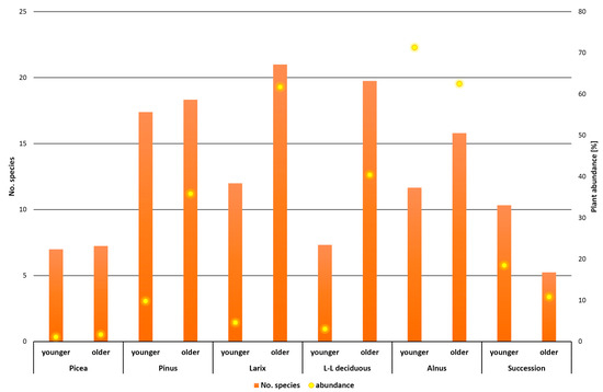 The species composition of the plant community resulting from spontaneous succession was characterized by a fairly balanced representation of forest and non-forest species, especially in the younger phase. In this phase, Calamagrostis epigejos or Tussilago farfara was still the dominant species. In older stands, non-forest species were declining due to the greater canopy cover. The endangered taxon Pyrola minor (near-threatened category, IUCN) was recorded in these stands. Younger Larix stands were characterized by a low abundance of species in the herbaceous floor (Figure 4). The observed species involved only a few individuals. Non-forest species were mainly represented by Poa compressa, Crepis biennis, and Carduus acanthoides. Of the forest species, Milium effusum was recorded. Older phases of Larix stands were among the most species-rich stand types. The reason for this was probably the change in soil conditions, loosening up of the canopy, and subsequently, the occurrence of heliophytes. The plant communities here were well developed. Non-forest species of the genus Festuca or Achillea millefolium and Pimpinella saxifraga and a relatively large number of seedlings of other woody plants were well established in these stands.