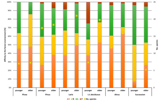 Affinity to the forest environment—distribution of functional groups in forest type and different ages. I—species occurring both in the forest and non-forest vegetation, N—species without spontaneously occurring in Czech forests, L—relatively a forest species, F—forest species.