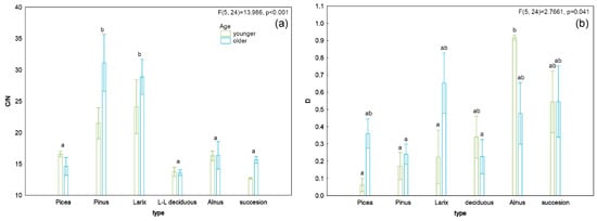 Results of factorial ANOVA. (a) C/N ratio, (b) D—Simpson’s diversity index. Error bars indicate standard errors, and bar height is the mean value. Categories on the X-axis show stand type in two age categories (younger—green, older—blue). The letters indicate significant differences based on the post hoc Tukey test, assuming p < 0.05.