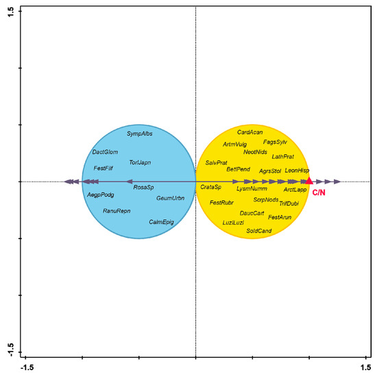 Van Dobben circles on the bases of CCA, the blue circle shows species negative responses, and the yellow ring shows the positive reactions of species on the C/N ratio (red triangle). Aegopodium podagraria—AegpPodg; Agrostis stolonifera—AgrsStol; Arctium lappa—ArctLapp; Artemisia vulgaris—ArtmVulg; Betula pendula—BetlPend; Carduus acanthoides—CardAcan; Calamagrostis epigejos—CalmEpig; Crataegus sp. —CrataSp; Dactilis glomerata—DactGlom; Daucus carota—DaucCart; Fagus sylvatica—FagsSylv; Festuca arundinacea—FestArun; Festuca ovina—Festovin; Festuca rubra—FestRubr; Geum urbanum—GeumUrbn; Lathyrus pratensis—LathPrat; Leontodon hispidus—LeonHisp; Luzula luzuloides—LuzlLuzl; Lysimachia nummularia—LysmNumn; Neottia nidus-avis—NeotNids; Ranunculus repens—RanuRepn; Rosa sp.—RosaSp; Salvia —SalvPrat; Scrophularia nodosa—ScrpNods; Solidago canadensis—SoldCand; Symphoricarpos albus—SympAlbs; Torilis japonica—TorlJapn; Trifolium dubium—TrifDubi.