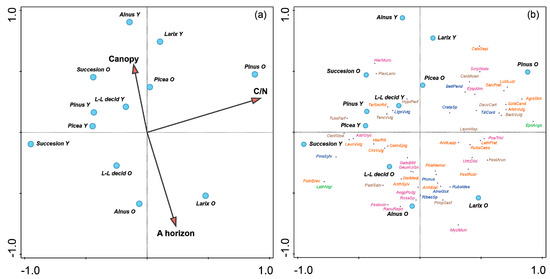 Plant diversity as expressed by the Simpson’s index (Figure 6b) varied among stand types (F = 2.8, p = 0.04). The highest values were measured in younger stands of Alnus and the lowest in younger stands of Picea. Interesting results were obtained in successional stands of both age categories and in older stands of Larix and Alnus. The Larix stands in the younger stages were species-poor, but with increasing age many species entered the understorey, and diversity increased significantly. The CCA analysis (Figure 8a) shows the different characteristics of the studied forest stands over time. C/N, A horizon depth, and tree canopy were used as explanatory variables. These factors were selected as best explained by the forward selection function (above). The projections showed that younger stands of Alnus and Larix typically have a dense canopy, but canopy cover decreases with increasing age. The change over time is most pronounced in stands of Alnus, Larix, and long-lived deciduous trees. Over a period of about 20 years, the tree canopy becomes looser, but at the same time, due to well-distributed litter, a good humus is formed, represented by the horizon A. Succession stands have a lower tree canopy richness at younger stages due to natural, gradual, and spontaneous colonization by different tree species, dominated by Salix or Betula, and canopy cover increases with stand age. The least striking changes, in terms of crown involvement and A horizon development, occurred in Picea stands, which did not differ much from each other. Picea and Pinus stands also did not differ much in terms of the parameters observed at younger stages. The A horizon deepened as the tree canopy became more open.