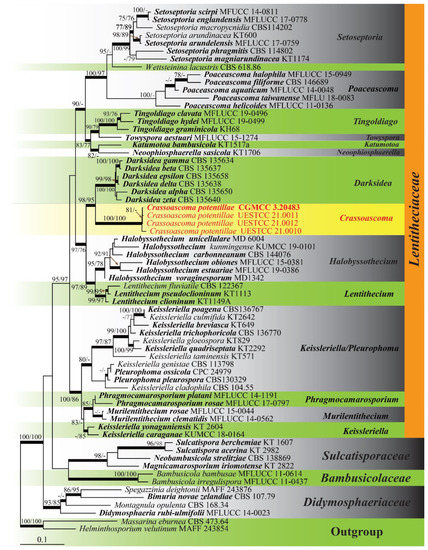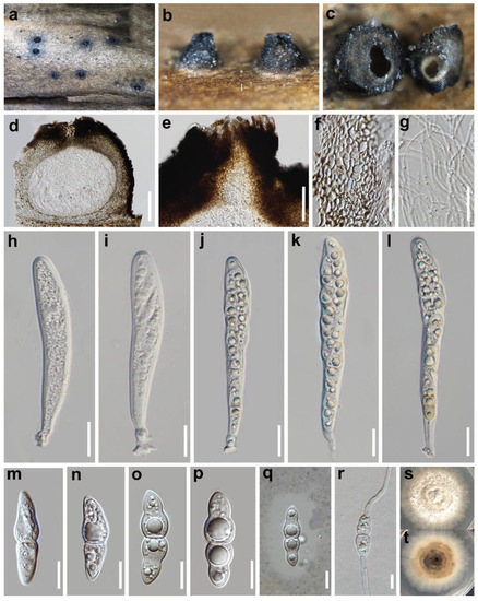 - Jiang, H.B.; Phookamsak, R.; Doilom, M.; Mortimer, P.E.; Xu, J.C.; Lumyong, S.; Hyde, K.D.; Karunarathna, S.C. Taxonomic and phylogenetic characterizations of Keissleriella bambusicola sp. nov. (Lentitheciaceae, Pleosporales) from Yunnan, China. Phytotaxa 2019, 423, 129–144. [Google Scholar] [CrossRef]
