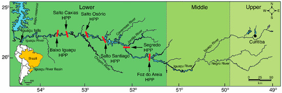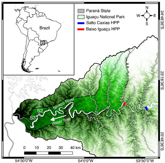The Iguaçu River is one of the largest southern tributaries of the Paraná River, integrating the most heavily fragmented watershed in South America [8]. This river is the second most polluted urban river in Brazil [9], and the pollution is mainly from industrial and domestic sewage from urban areas in the Higher Iguaçu region [10]. Water pollution, especially from contamination by pesticides used in agriculture, has negatively affected fish species in streams in the middle and lower portions of the basin [11,12,13]. In addition, the Iguaçu river basin is significant, being considered an ecoregion [14] with many endemic fishes [14,15]. Of the 127 known fish species in the basin [16,17], 76 were identified only in the Lower Iguaçu river basin, of which 42% are endemic, and three are endangered and sampled in low abundance (<1%) (Gymnogeophagus taroba, Psalidodon gymnogenys, and S. melanodermatum) [18]. Those species are partially protected by the Iguaçu National Park (INP), a world heritage site and one of the few remaining areas of Atlantic Forest protected by law. Due to the favorable topographical relief of the Lower Iguaçu River, six hydroelectric dams (Figure 1) have been built since 1975, transforming the original rapids and waterfalls into a sequence of flooded areas [17,19]. These constructions changed the landscape and the physical, chemical, and biological characteristics [17], generating a decline in habitat quality and occupation area for rheophilic fishes [20]. The Baixo Iguaçu HPP operation was authorized in 2019 [19] by the Brazilian Federal Government [21,22,23], despite being very controversial, due to the possible impacts on the INP, located only about 500 m downstream of the HPP [19].