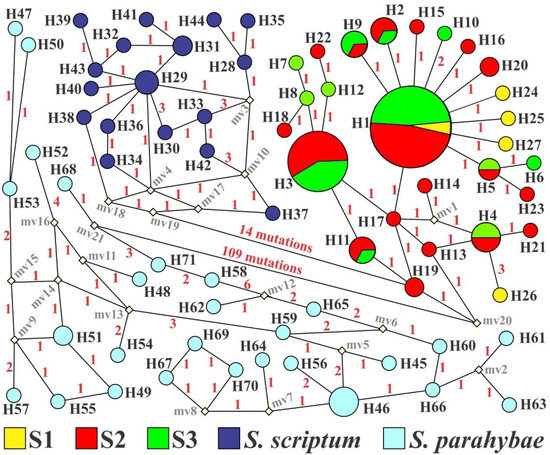 A fragment of 869 bp of the D-loop region was sequenced for each of the 95 captured S. melanodermatum specimens. The mtDNA analyzes showed high values of haplotype diversity (h > 0.5), ranging from 0.759 (S3) to 1.000 (S1), and low values of nucleotide diversity (π < 0.5%), ranging from 0.0029 (S3) to 0.0048 (S1) (Table 1). Twenty-seven different haplotypes were revealed, resulting from 22 polymorphic sites (16 transition and six transversion mutations), and two indel sites were found. The haplotype network showed no genetic structure, with few mutational steps among the haplotypes. H1 was the most common internal haplotype (n = 27) in all samples. The sample with the highest number of singletons was S2, with 11 haplotypes, followed by S1, with four haplotypes. Seventeen different haplotypes were observed in S. scriptum and 27 in S. parahybae. At least 14 and 109 mutational steps separate S. scriptum and S. parahybae from S. melanodermatum, respectively (Figure 3).
