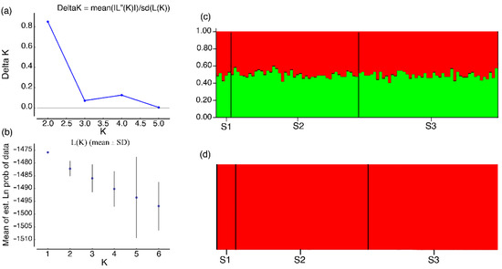 - Pritchard, J.K.; Stephens, M.; Donnelly, P. Inference of population structure using multilocus genotype data. Genetics 2000, 155, 945–959. [Google Scholar] [CrossRef]