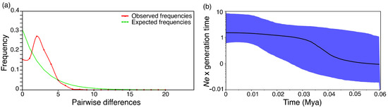 The mitochondrial mismatch distribution graph (Figure 5a) demonstrates the unimodal distribution for all haplotype frequencies, indicating demographic expansion. The BSP analysis revealed an initial demographic expansion between 50 to 40 kya, with a considerable change in effective population size between 40 to 30 kya, accompanied by stabilization (Figure 5b). According to the linkage disequilibrium (LD) method, the Ne was 148.4 (confidence interval—CI 95%: 70.2–977.6) (Table 2).