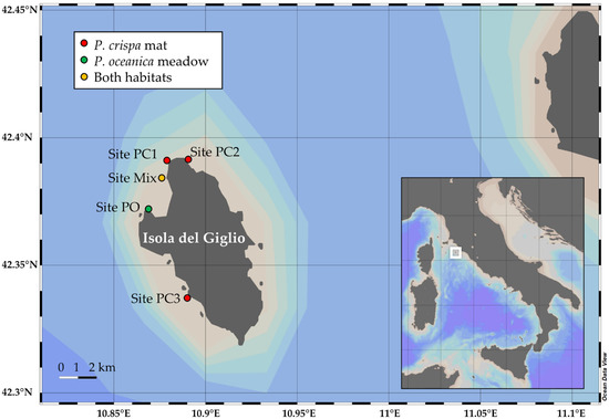 Location of the study area in the Tyrrhenian Sea with sampling sites around Giglio Island marked in red for Phyllophora crispa mats, green for Posidonia oceanica meadows, and yellow where both habitats were sampled, made with OceanDataView [50].